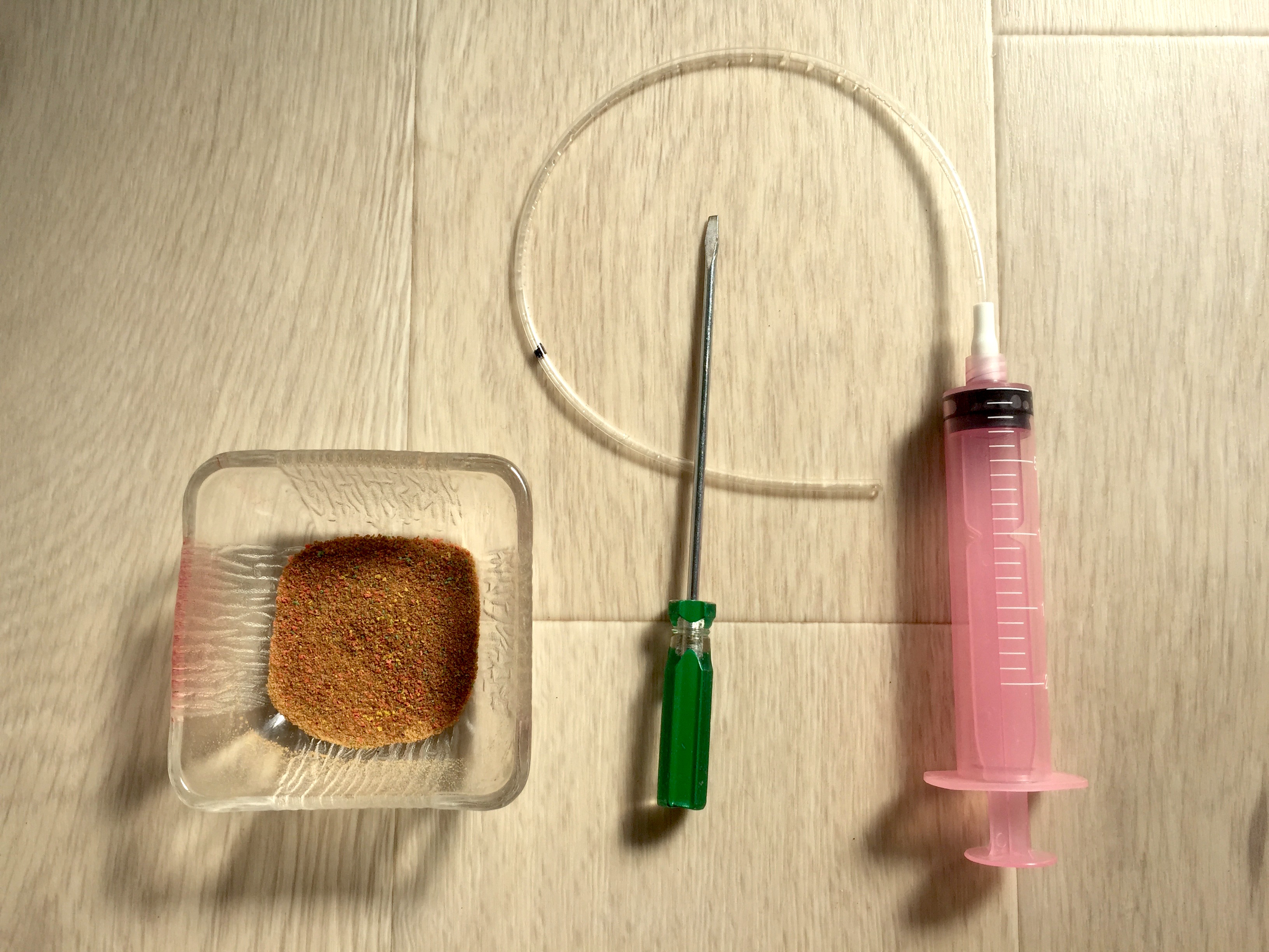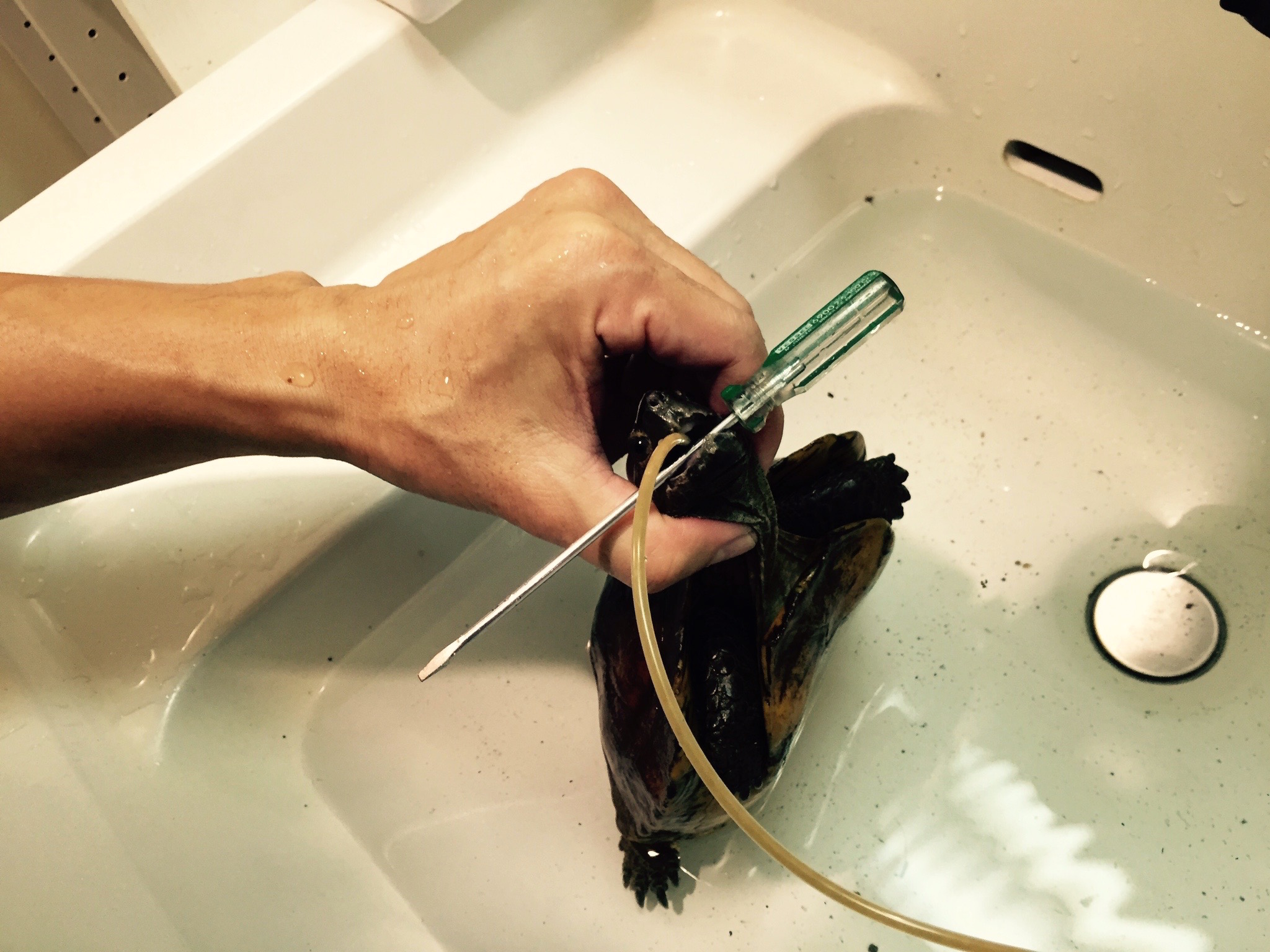 頭部をホールドできた後は細めのドライバーなどで口を開け、そのまま猿ぐつわ状に押さえ付けてチューブを胃の辺りまで差し込みます。