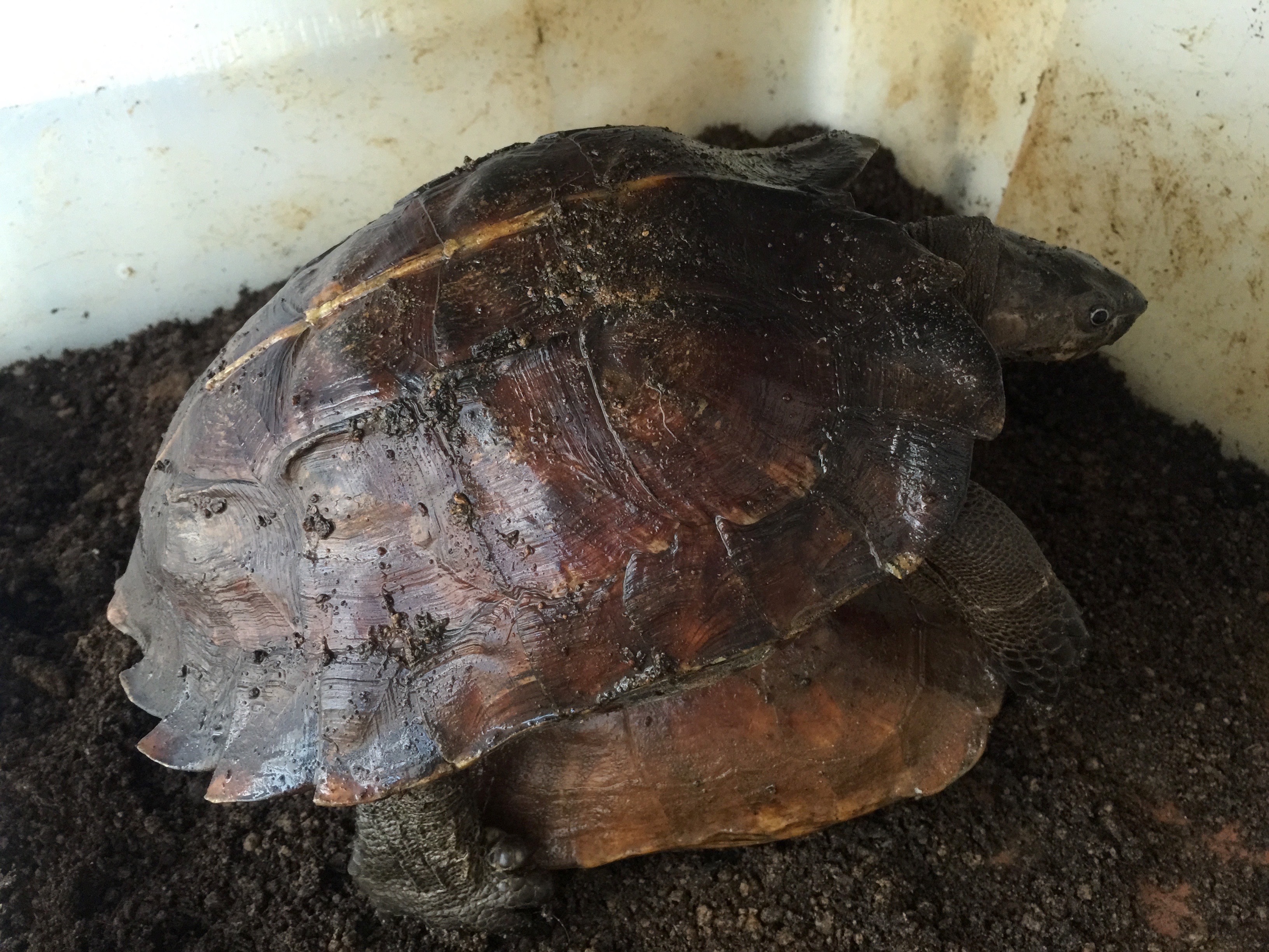 以前にも書きましたが、トゲヤマガメは頭部が甲羅の中心あたりまで入ってしまう上に柔軟性があるため、私が扱ってきた中では強制給餌が難しいカメです。