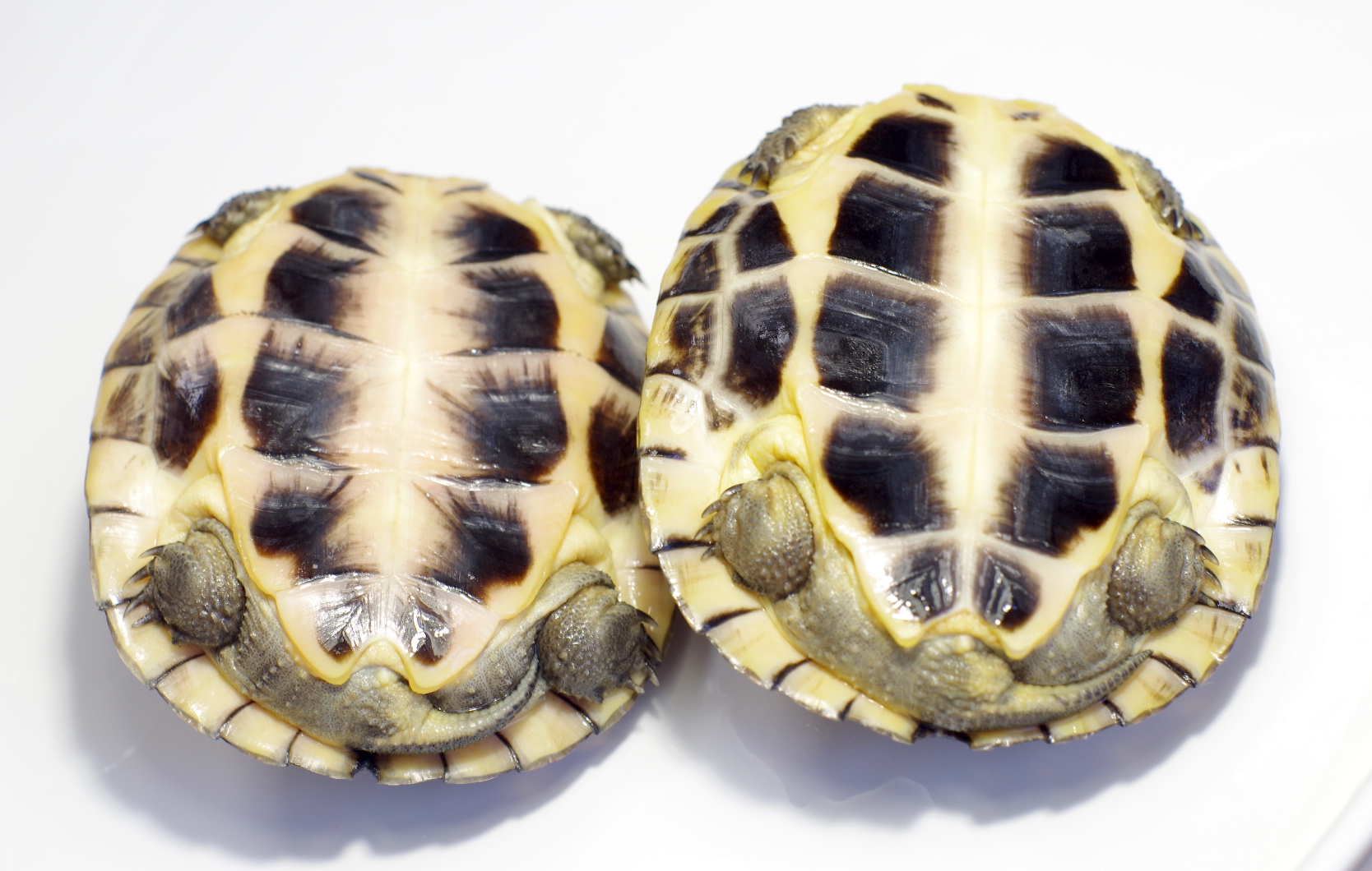 まずは腹甲の凹み具合。上が暫定オス、下が暫定メスです。僅かではありますが、違いが出てきています。